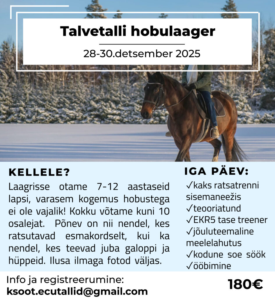 Ühepäeva hobulaager 16.märts 2025 10:00-15:00 Kellele?Laagrisse ootame lapsi vanuses 7-12 aastat. Varasem kokkupuude hobustega ei ole vajalik. Kokku võtame kuni 6 osalejat. Lapsed saavad ratsutada kogenud treeneri juhendamisel, harjutused valitakse individuaalselt tasemele vastavalt. Põnev on nii nendel, kes ratsutavad esmakordselt kui ka nendel, kes juba teevad galoppi ja väikseid hüppeid! Tegevused:Ratsutamine Hobuhooldus praktika Pildistamine hobustega Soe lõunasöök Hobumaiuste töötuba Liikumis mängud Info ja registreerumine: ksoot.ecutallid@gmail.com Tasu: 60