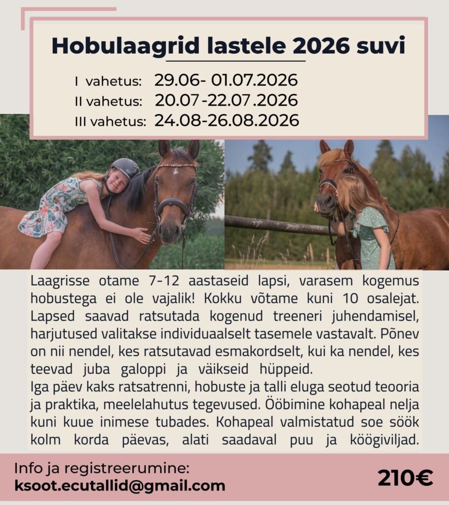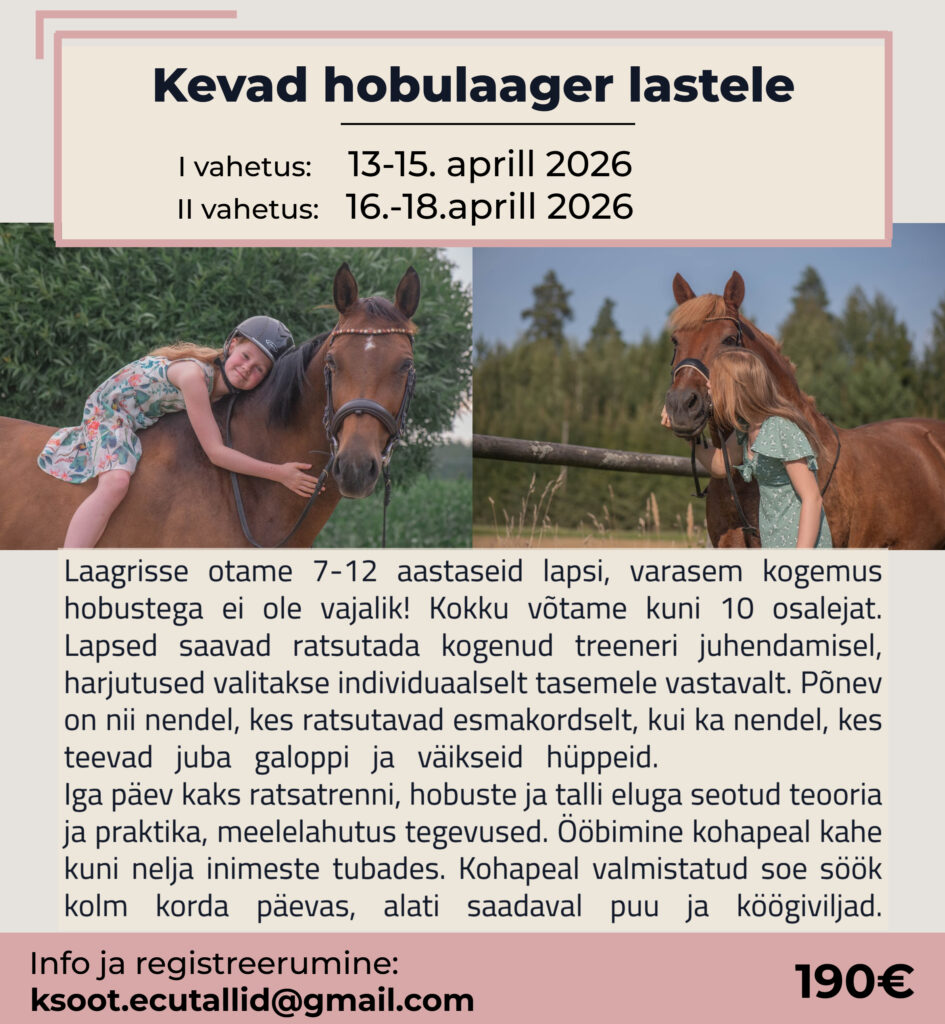 Ühepäeva hobulaager 16.märts 2025 10:00-15:00 Kellele?Laagrisse ootame lapsi vanuses 7-12 aastat. Varasem kokkupuude hobustega ei ole vajalik. Kokku võtame kuni 6 osalejat. Lapsed saavad ratsutada kogenud treeneri juhendamisel, harjutused valitakse individuaalselt tasemele vastavalt. Põnev on nii nendel, kes ratsutavad esmakordselt kui ka nendel, kes juba teevad galoppi ja väikseid hüppeid! Tegevused:Ratsutamine Hobuhooldus praktika Pildistamine hobustega Soe lõunasöök Hobumaiuste töötuba Liikumis mängud Info ja registreerumine: ksoot.ecutallid@gmail.com Tasu: 60
